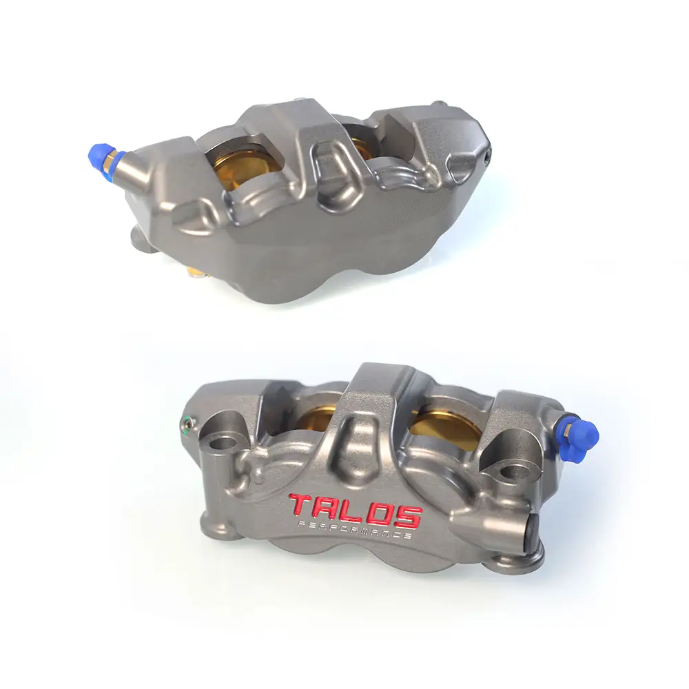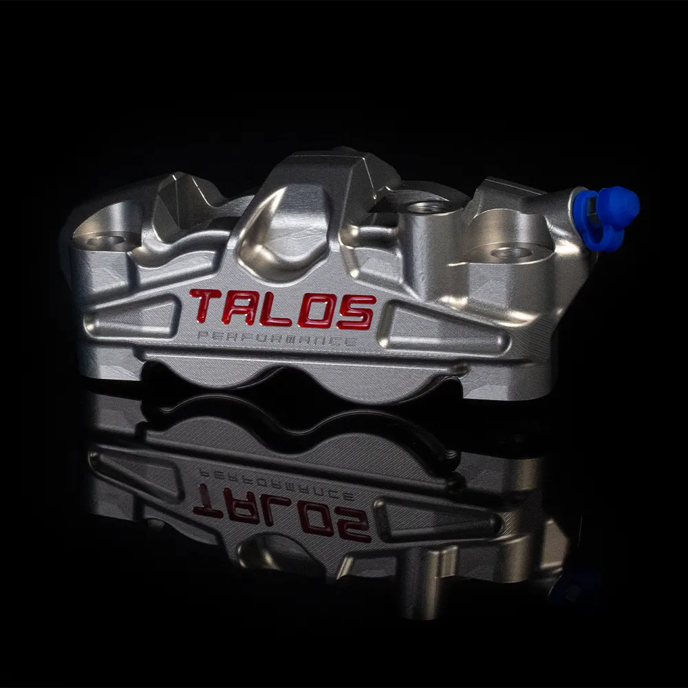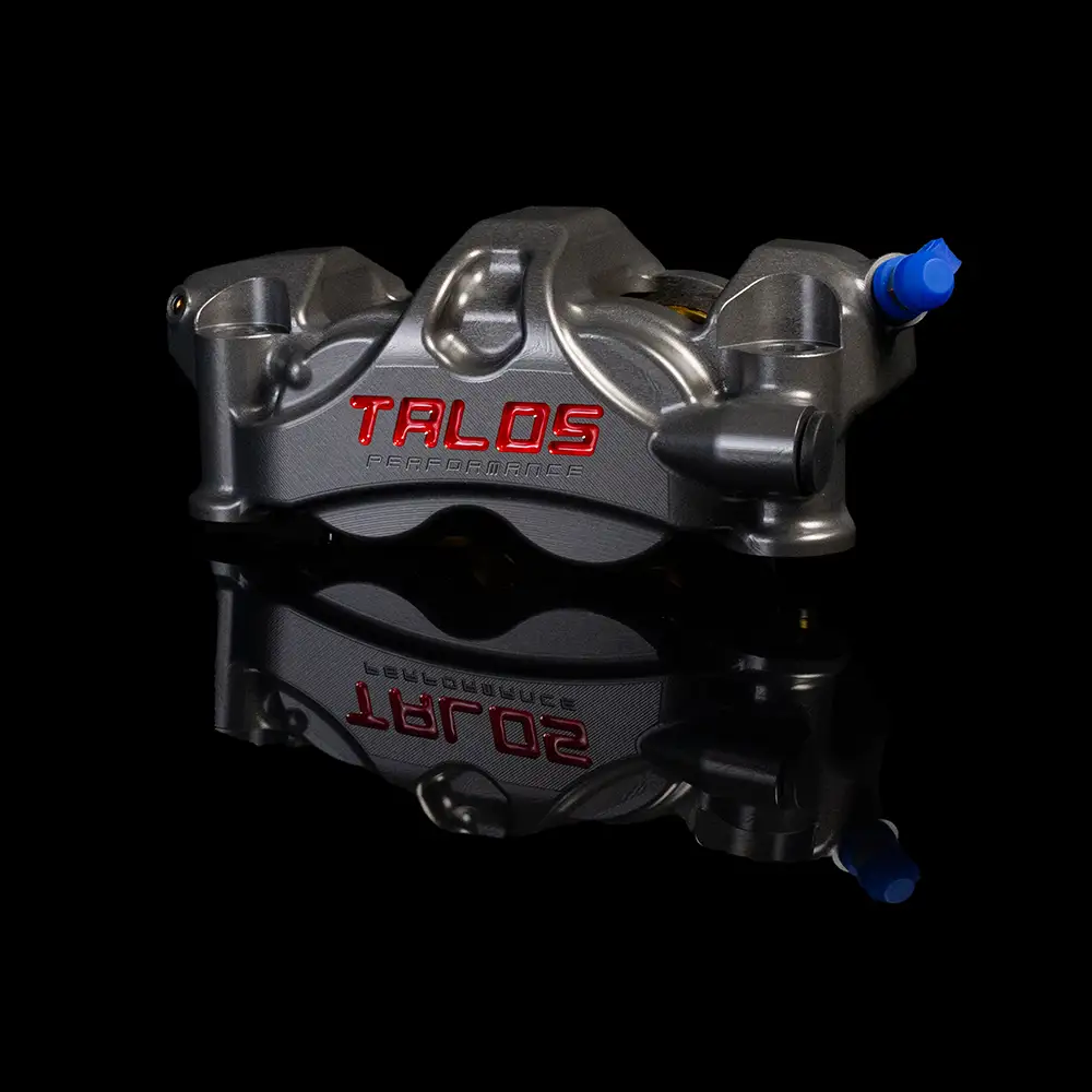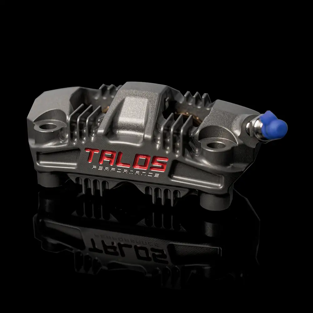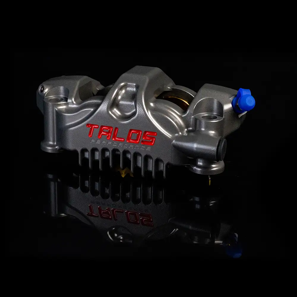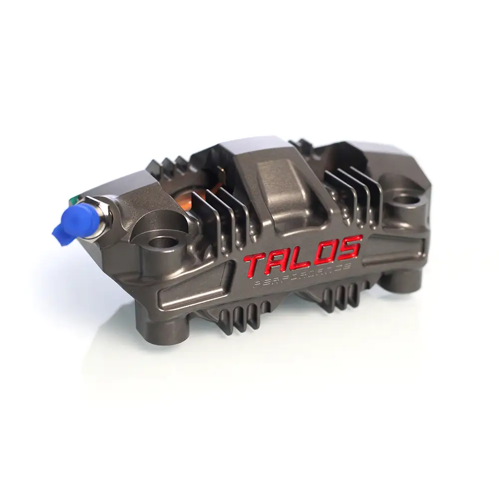 Le pinze freno Talos sono realizzate in monoblocco di alluminio billet, dotate di pistoni differenziati e trattamento anti-surriscaldamento.