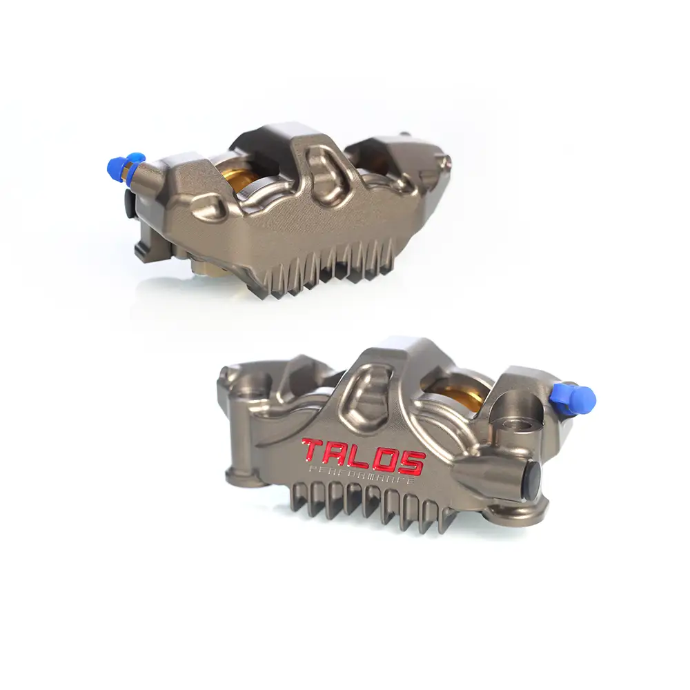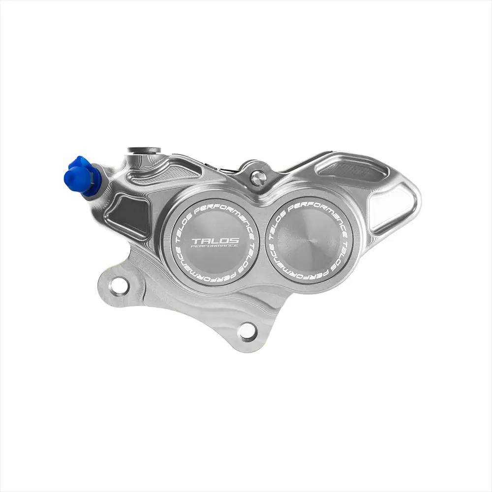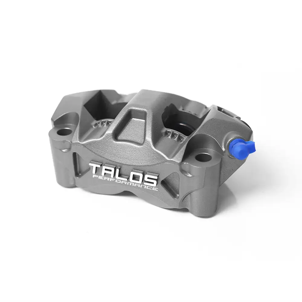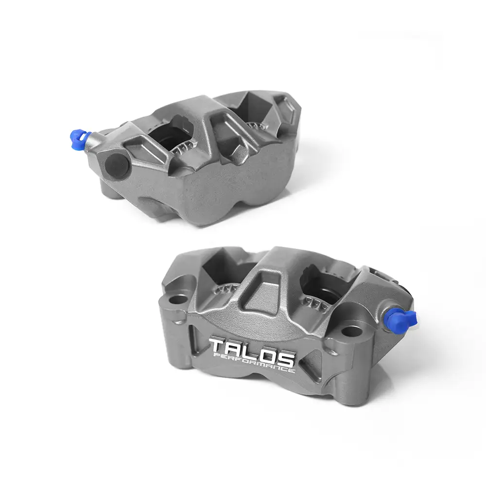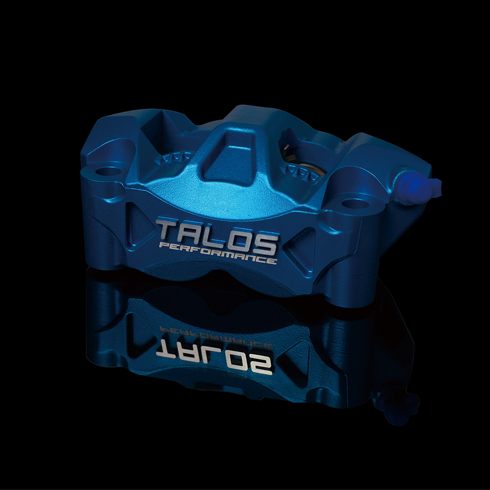Le pinze freno Talos sono realizzate in monoblocco di alluminio billet, dotate di pistoni differenziati e trattamento anti-surriscaldamento.